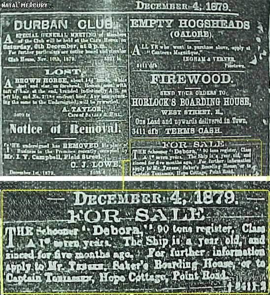 DVL Note: See Yngve Nedrebø E-mail dated 28 Feb 1998 : "The vessel [Debora (3)] made the trip to Madagascar, went on to Natal, and they put the vessel up for sale Dec. 4, 1879. After several rounds of disappointments, the vessel was sold (February 1881) to Torstein Tobiassen (Egeland) (born 1842, died 1936). He owned the vessel for a few years, then sold it to a Creole around 1884, and soon thereafter Torstein Tobiassen returned to Lyngdal in Norway. Tobiassen told his son Tobias Bernhard Tobiassen (born 1891 in Lyngdal, Norway) that Debora had sunk off the coast of South Africa soon after the vessel had been sold."