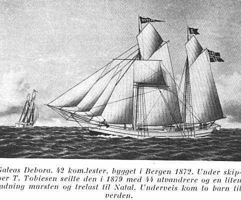 NORWEGIAN EMIGRATION - THE DEBORA EXPEDITION SUMMARY The Debora Expedition sailed from Bergen in 1879 to establish a Norwegian colony on an Indian Ocean atoll called Aldabra. The organisers endeavoured to find practical and Christian people to create a settlement based on the teachings of the Norwegian preacher Hans Nielsen Hauge (1771 -1824). The expedition was aborted in Madagascar - a few of the participants remained in Madagascar and the rest settled in the British colony of Port Natal (Durban). They were the first group of Norwegian emigrants to settle in Port Natal. The forty-seven persons who took part in the Debora Expedition were:- Captain Tobiassen and wife, mate Berentsen and wife, mate Oftedal, A Olsen and wife, I Iversen and wife, O Heidalsvig and wife (Høidalsvig - Heidalewig), J Finsen and wife, K Bang and wife with three children (Amanda, Severin and Knut), F Larsen and wife with six children (Angel, Emil, Sigvart, the three sons of the late Sivert Andersen Hordnes, and Petra, Ludvig and Karl), H Johnsen and wife with three children (Sina, Josefine and Karl), A Andreassen and wife with three children (I don't remember their names), R Andersen, R Rasmussen, K Jensen, Hesselberg, Grang, O Fosdal, E Eriksen, P Bang, E Ellingsen, widow Egelandsdal and Miss Serene Larsen. Two children were born on the voyage: a son to Mr and Mrs F Larsen and a son to Mr and Mrs Andreassen. |