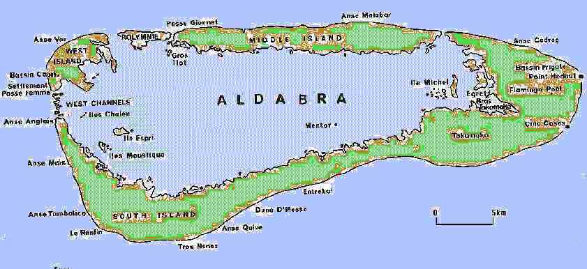 Its inhospitable terrain and sparse fresh water supply has helped preserve Aldabra as a naturalist's haven, but it was not always so. To the Portuguese goes the credit of including the atoll first in a map in 1509. Settlers, and even pirates, kept away from the island until in 1814 it became part of the British colony of Mauritius. It probably irked the British adminstrators that such a large territory (60 square miles of land and a lagoon of 130 square miles) should serve no useful purpose and contribute no money to the exchequer. Leases were issued right up to 1955 for commercial exploitation of timber, green turtles, and fishing. But every attempt to exploit Aldabra's natural resources was, fortunately for nature- lovers, doomed to failure.