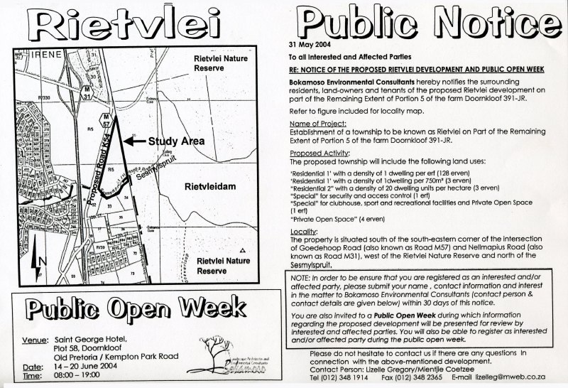 Bokamoso Environmental Consultants hereby notifies the surrounding residents, land-owners and tenants of the proposed Rietvlei development on part of the Remaining Extent of Portion 5 of the farm Doornkloof 391-JR.