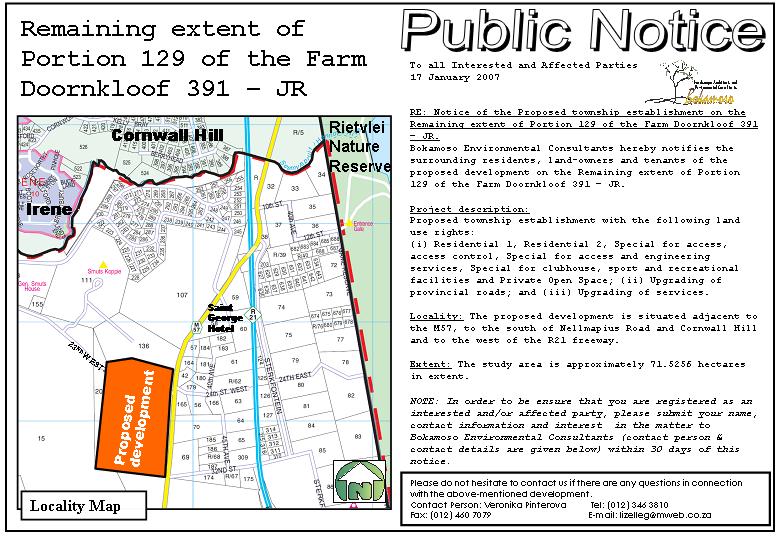 Please find attached Public Notice regarding the proposed development on Portion 129 Doorknloof 391 JR.