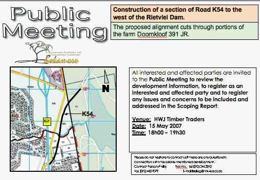 " ... invitation to Public meeting regarding Construction of a section of Road K54 to the west of the Rietvlei Dam ... "