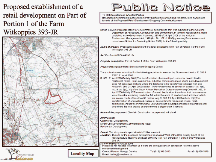 Name of project: Proposed establishment of a retail development on Part of Portion 1 of the Farm Witkoppies 393-JR