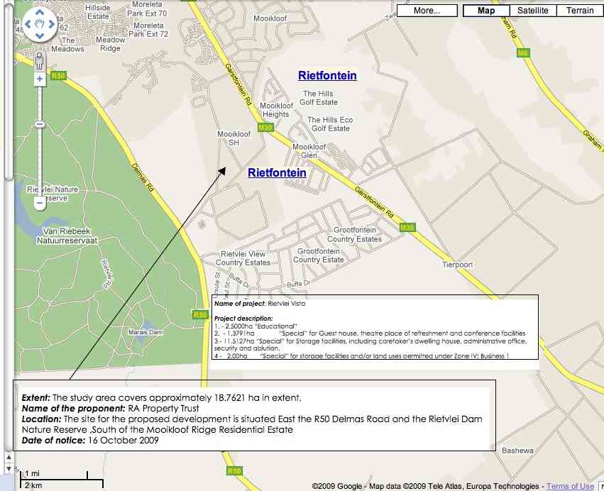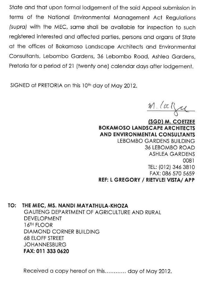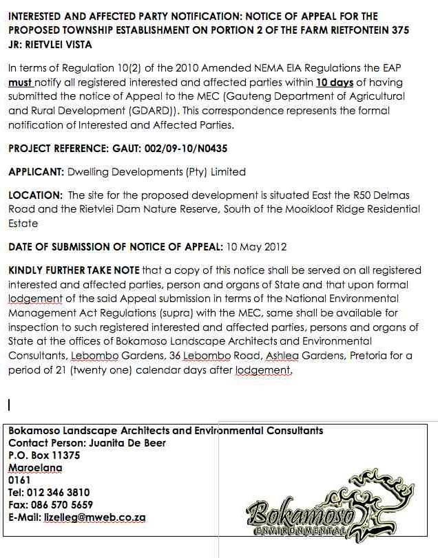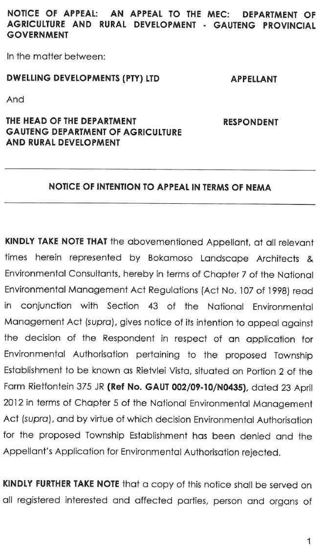Look at the following attachment regarding the Rietvlei Vista Project – Notice of Appeal