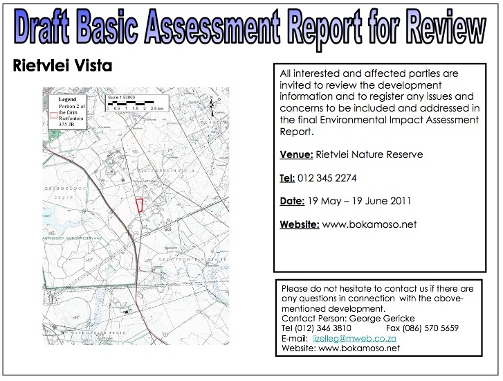 Please refer to the attached invitation to review the Draft Basic Assessment Report for the proposed Rietvlei Vista project. The draft report will be available in hard copy at the given venue in the attachment. It is also available for download on www.bokamoso.net. Click on Current Public Processes and follow the link. Please don’t hesitate to contact our offices for any additional information.