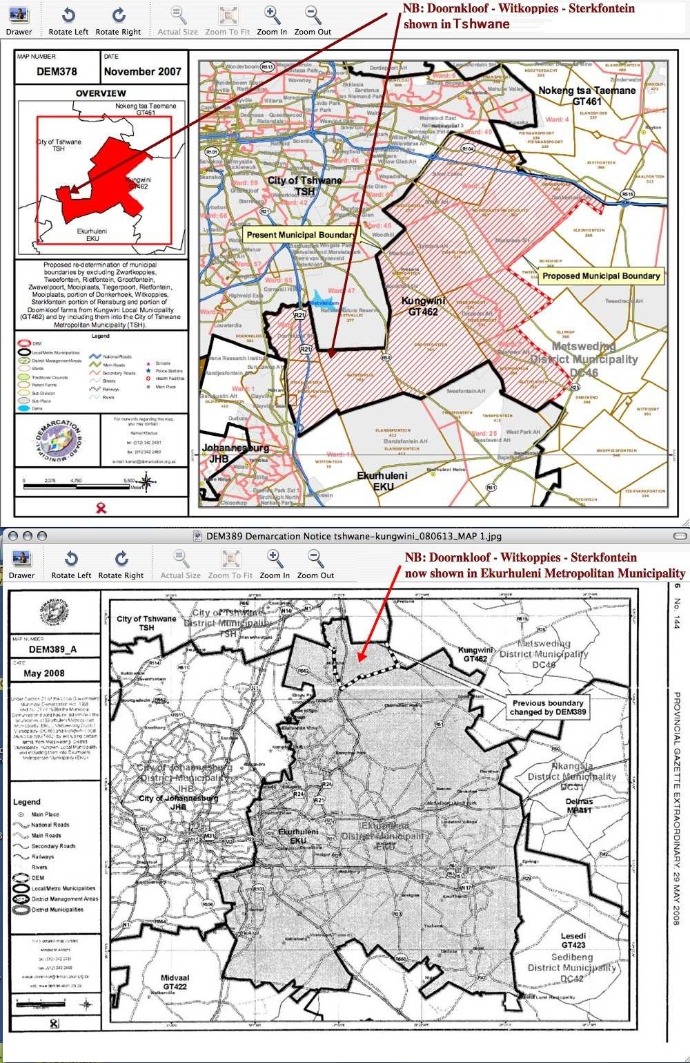 Includes a map that shows portions of the farms Doornkloof, Witkoppies and Sterkforntein as part of Ekurhuleni Metropolitan Municipality. This document gives until the end of June for comments to be submitted to the MUNICIPAL DEMARCATION BOARD.