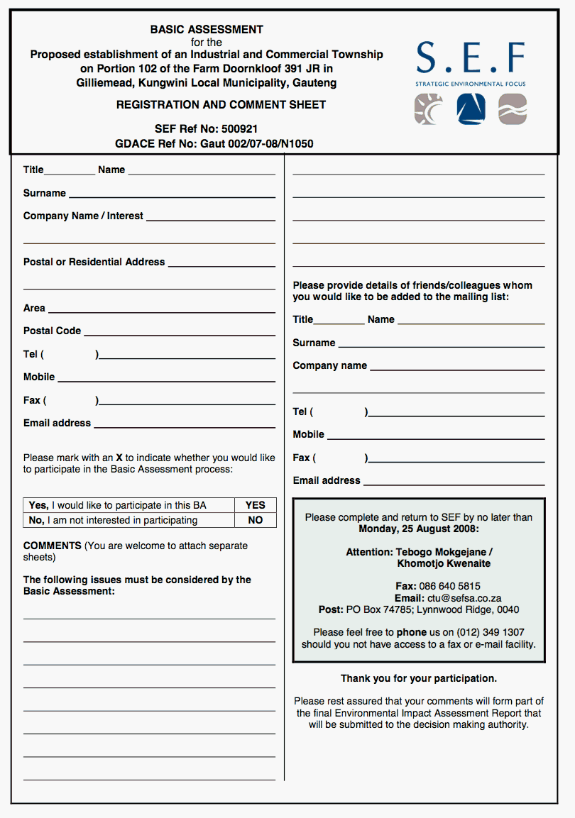 Strategic Environmental Focus (Pty) Ltd (SEF) would like to thank all the interested and affected