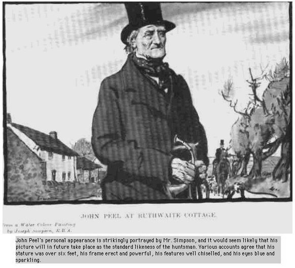John Peel: A favourite English hunting song, dating from shortly before the middle of the l9th century. The hero, John Peel, was a Cumberland farmer, who kept a pack of fox hounds. The words of the song are by John Woodcock Graves, a fellow Cumbrian and their origin was told by the author to this effect.
