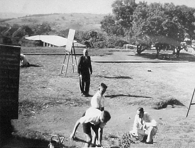 During the 1947 Royal Visit to South Africa two trees were planted in the upper playground of the Sea View (Seaview) Government School. Planting the "Boys Tree" are David Larsen (with spade) and Richard Askham. Mr Wolmaraans (kneeling) supervises. The school Headmaster Mr C Selwyn-Smith is standing in the background. (Kneeling behind the left hand blackboard is one of two pupils planting the "Girls Tree")
